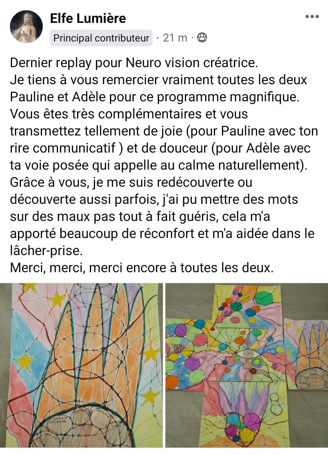 Pauline t’accompagne par le dessin et te guide en NeuroArt afin que tu transcendes ta création pour aller bien au-delà. Adèle est là pour agrémenter les étapes par de douces et profondes visualisations afin de recentrer régulièrement ton attention au centre de toi sur le principal : ta présence et tes sensations.